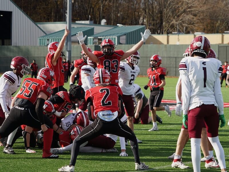 Watertown’s defense celebrates after stopping Belmont on fourth down late in the Thanksgiving Day Game. (Photo by Charlie Breitrose)