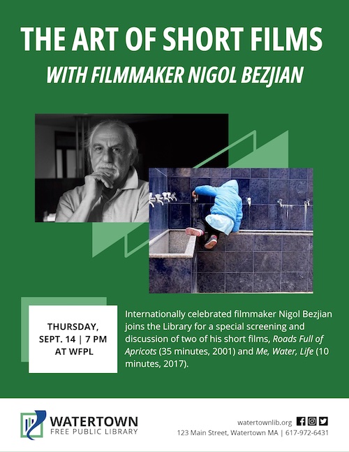 Internationally celebrated filmmaker Nigol Bezjian joins the Watertown Free Public Library for a special screening and discussion of two of his short films, Roads Full of Apricots (35 minutes, 2001) and Me, Water, Life (10 minutes, 2017). The event will be held at the library at 123 Main Street on Thursday, September 12, 2024 at 7 p.m.