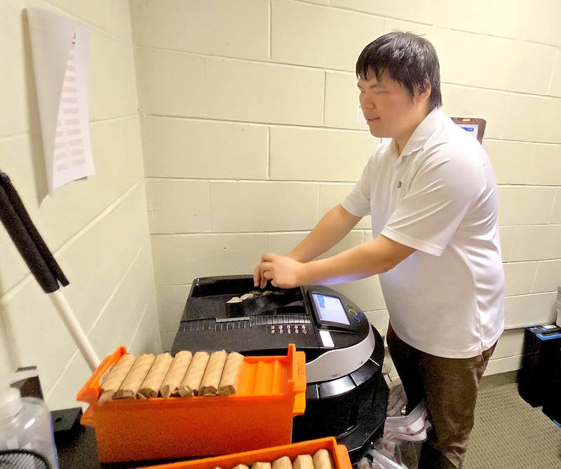 Perkins School for the Blind student Hugh helps Watertown Savings Bank sort coins as part of a work experience partnership. (Photo by Charlie Breitrose)
