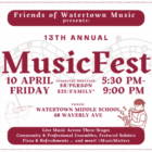 Friends of Watertown Music invites you to our 13th Annual MusicFest this Friday, April 10th. Doors open at 5:15 p.m. and performances start promptly at 5:30 p.m.! Come celebrate music with us!