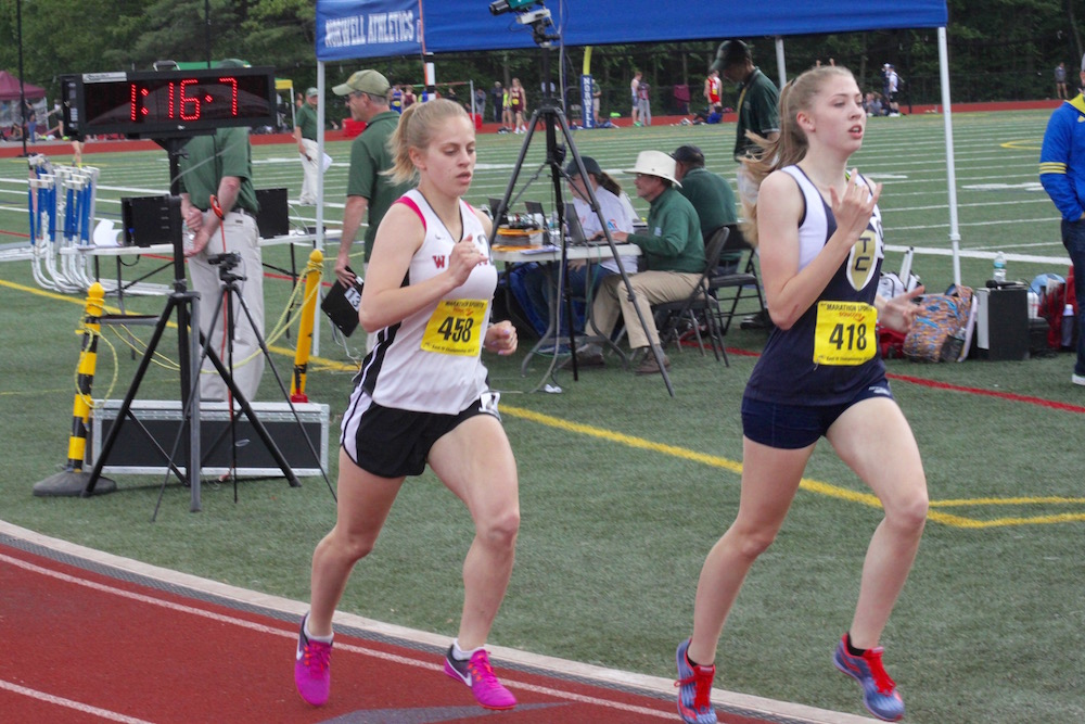 Watertown runners junior Emily Koufos, left, and junior Elizabeth Powderly, right, both placed in the points for the Raiders in the mile run at Sundays Div. 4 Emass meet.
