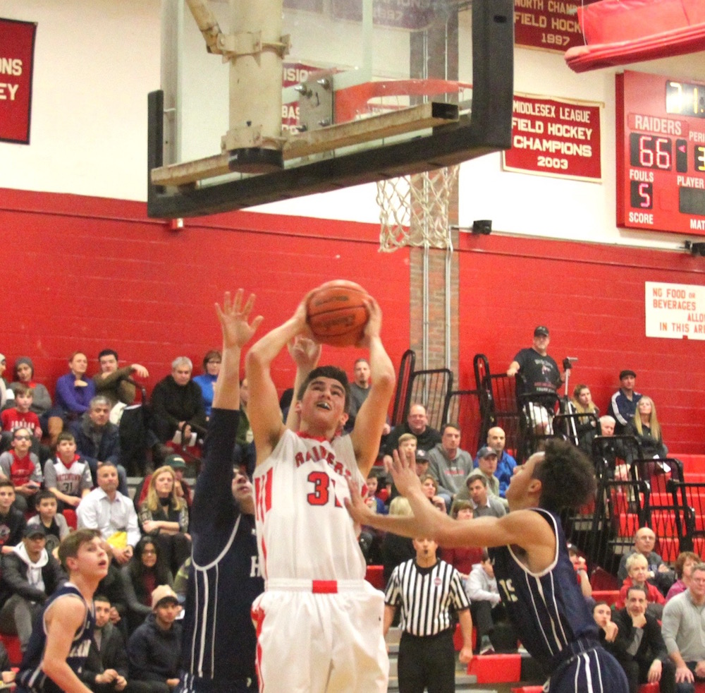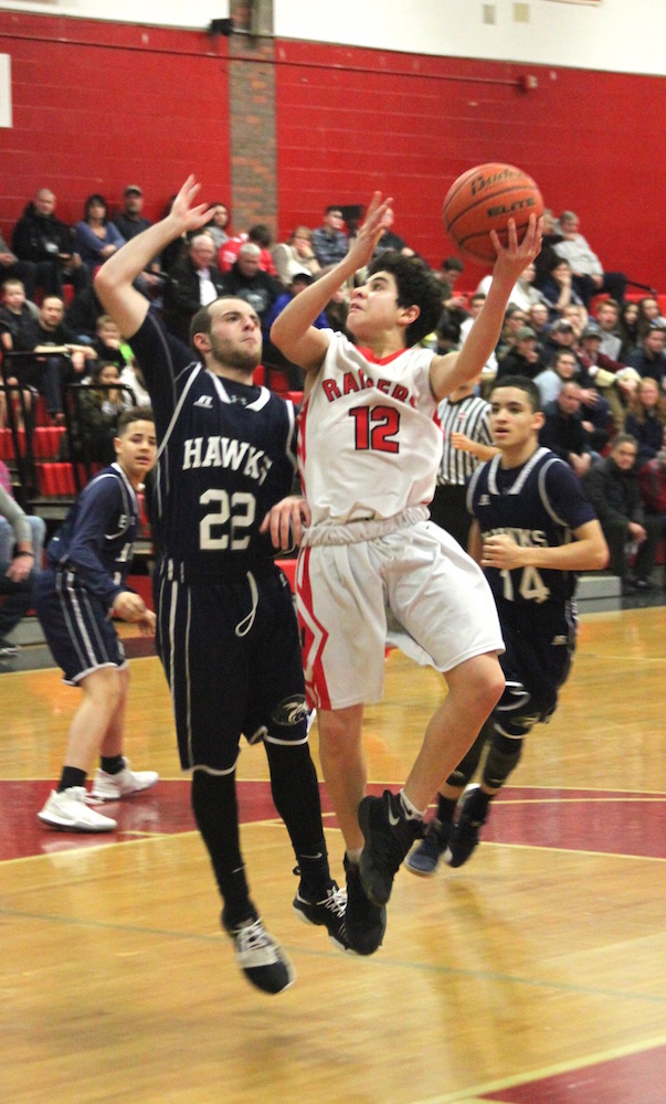 The Raiders hit the floor like they were on a mission and jumped out to an 18-0 lead. Essex Tech got its first point on a free throw with just over 2:30 left in the first quarter, which was answered with a three pointer by freshman guard Gabe Spinelli. By halftime, Watertown had taken out its starters and had eclipsed the 50 point mark, leading 51-14.