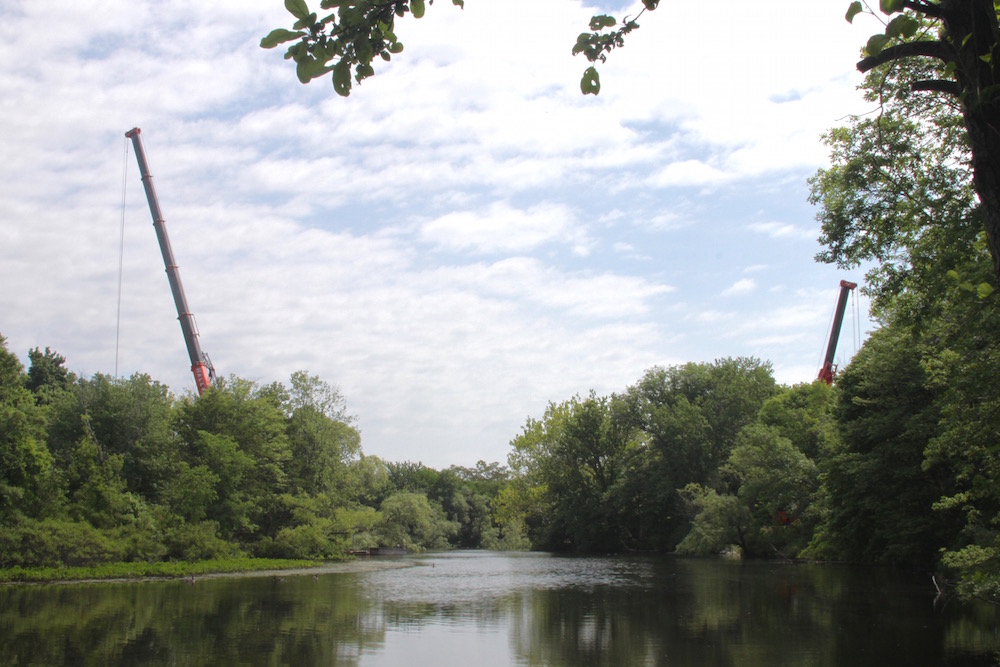 The four sections, two on each side of the river, were bolted together into one piece on either side of the river. Starting about 7 a.m. Thursday, Green said, the two cranes will lift the pieces into place.