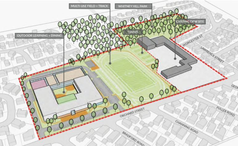 An illustration of how Watertown High School could be built on both sides of Common Street. In this scenario, the main academic building replaces the former Phillips School, while the gym, auditorium and Senior Center go on the current WHS site.