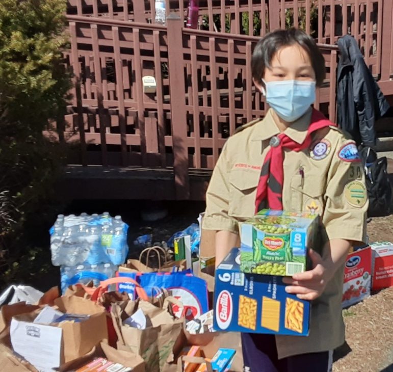 The answer to Cunningham’s question was yes, and March 20, scouts from Troop 30 (age 10-17) and Pack 30 (age 5-10) responded, collecting 5186 pounds of groceries, cleaning supplies and personal items from Watertown neighbors. Of particular note was the Bear Den of Pack 30, a group of third graders who together collected 1,500 pounds of food that had to be delivered to the Food Pantry in several cars and one pickup truck.