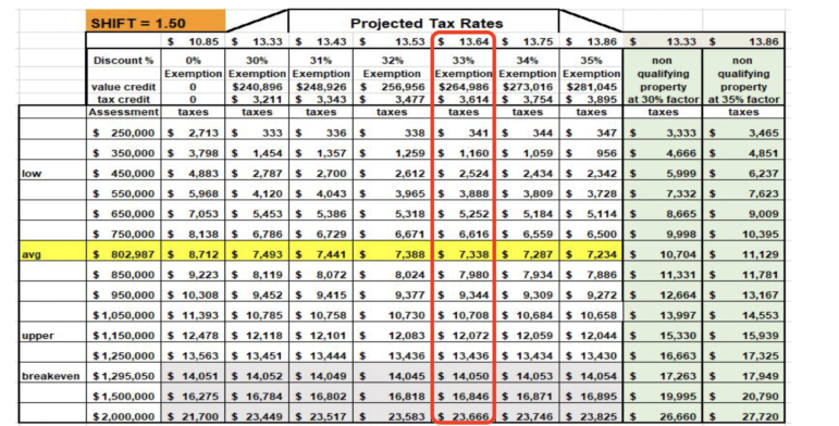 With the 150 percent shift to CIP, which creates the split tax rate, the residential rate is $10.85 per $100,000, and CIP is $19.74 per $100,000. That is before the residential exemption. With the 33 percent exemption, the residential rate is $13.64 per $100,000, and the properties with the exemption have their tax bills reduced by the $3,614 exemption.