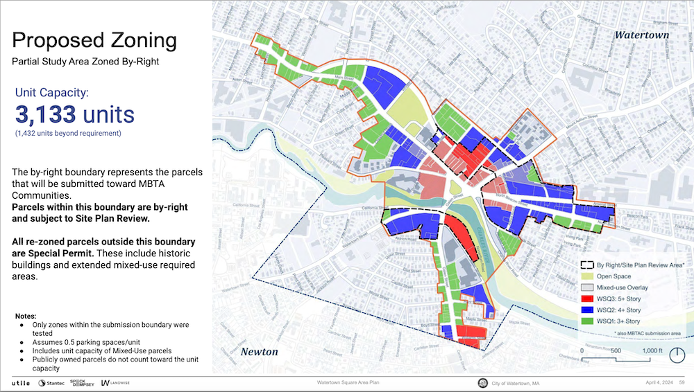 One of the most scrutinized parts of the plan has been how to meet the state’s requirement to allow at least 1,701 of housing units to be built by right in Watertown. The draft presented in April zones areas to allow more than 3,300 units by right, with other areas allowing construction of four, five or six stories of housing if a special permit is granted by the Zoning Board of Appeals or Planning Board (depending on which has the final authority).
