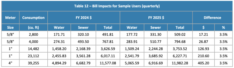 Water and sewer bills will be rising by 3.5 percent for Watertown residents and other customers. A residential customer who uses 4,000 cubic feet of water will see an increase of $26.87 per quarter. The rate for 100 cubic feet of water for tier 1, which is most single family homes, is $5.68 for water, $11.46 for sewer, and $17.14 combined.