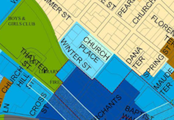 The tree-filled grassy area in Watertown’s main intersection is known for being green, but the City’s Planning Office changed the zoning map so it appeared to be one of the new Watertown Square zones that would allow for multi-story residential buildings.