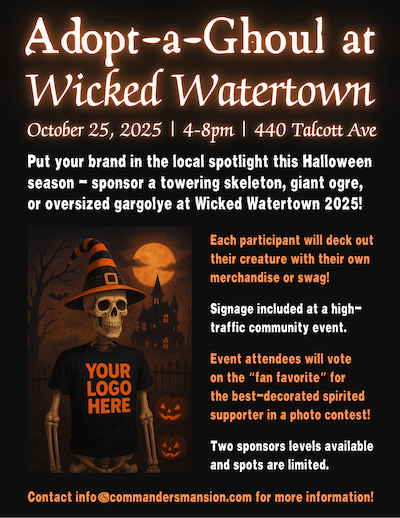 This Halloween, put your brand in the local spotlight! Sponsor a towering skeleton, giant ogre, or oversized gargoyle at Wicked Watertown on October 25, 2025 at the Commander’s Mansion from 4–8 p.m.