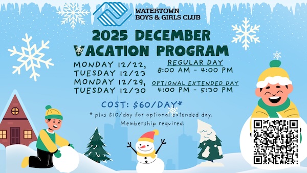 December vacation 2025 is longer that most years, and the Watertown Boys & Girls Club will be offering limited daily programs during the school break. See more information provided by the WBGC, below.