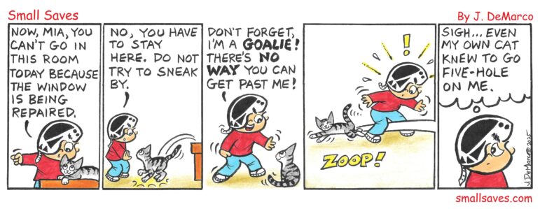 Combining this with the love of cartooning Small Saves emerged in 1991 and took on a life of his own. “To play goal – then come home and draw Small Saves — is my ideal definition of a good day.”