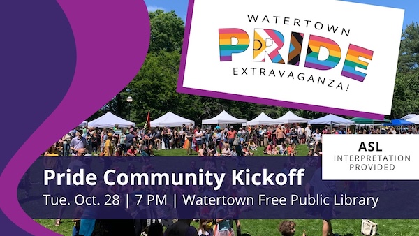 Do you want to help guide Watertown’s LGBTQ+ Pride celebration for 2026? On Tuesday, October 28, you’re invited to the Library to collaborate with other community members and envision an annual Pride event that is special and inclusive. American Sign Language (ASL) interpretation will be provided.