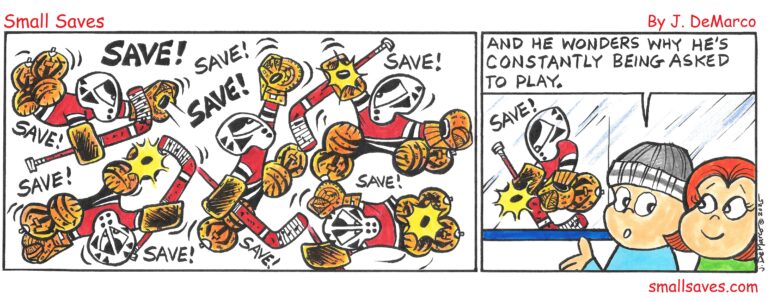 Combining this with the love of cartooning Small Saves emerged in 1991 and took on a life of his own. “To play goal – then come home and draw Small Saves — is my ideal definition of a good day.”