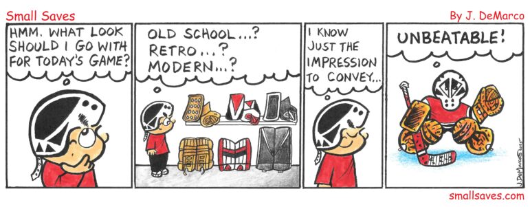 Combining this with the love of cartooning Small Saves emerged in 1991 and took on a life of his own. “To play goal – then come home and draw Small Saves — is my ideal definition of a good day.”
