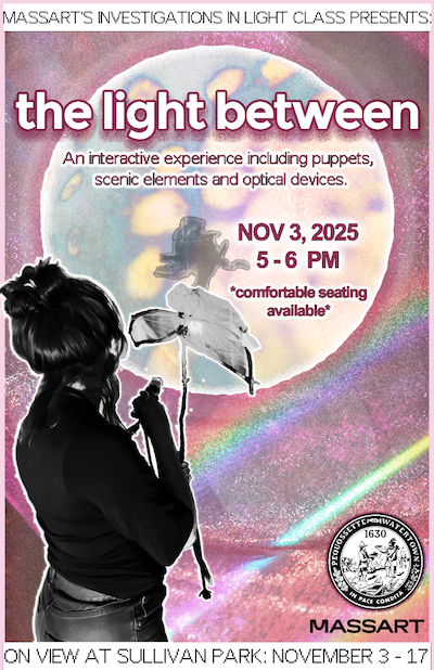 The City of Watertown is excited to announce the launch of a new temporary public art installation in partnership with the Massachusetts College of Art and Design (MassArt). “The Light Between” is created by students from the Investigations in Light class, led by Professor Elaine Buckholtz. The site-specific work will be on view at Sullivan Park, located at the corner of Arlington Street and Mount Auburn Street in Watertown, MA, from November 3 to November 17, 2025, with an interactive experience that includes puppets, scenic elements, and optical devices in a dynamic interplay of shadow and light on Monday, November 3, 2025, from 5:00 PM to 6:00 PM. Music and seating provided.