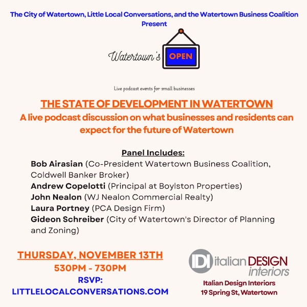 Hear about the State of Real Estate and Development in Watertown during the event at the Italian Design Interiors showroom in Watertown Square presented by the City of Watertown, Little Local Conversations, and the Watertown Business Coalition.
