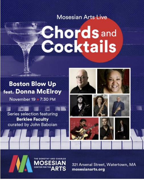 Boston Blow Up featuring Donna McElroy plays for one night only on Wednesday, Nov. 19, 2025 at 7:30 PM as part of Chords and Cocktails, the Mosesian Center for the Arts’ newly relaunched jazz series. Tickets are $40 (including fees) and can be purchased online at mosesianarts.org/timedevents/2106, and in person or by phone during their new box office hours on Tuesdays through Thursdays from 3:00-6:00 p.m. at 321 Arsenal Street, Watertown, MA and 617-923-0100. Email tickets@mosesianarts.org with any questions or for further details.