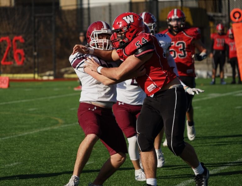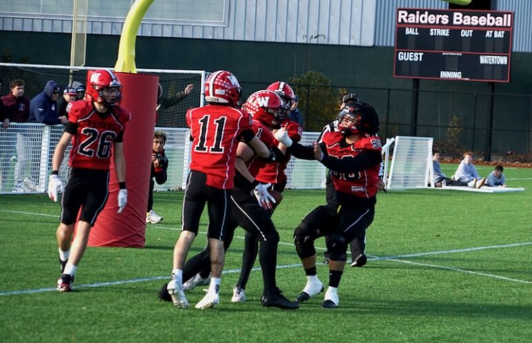 Senior Patrick McHugh, left, scored Watertown’s second touchdown on Thanksgiving. (Photo by Charlie Breitrose)