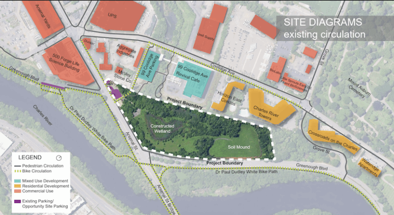 The proposal includes adding pathways around the site, a bike path through the area linking the Watertown-Cambridge Greenway to the Charles River, as well as a sensory pathway to make it accessible to the visually impaired. Signage about the history of the site have also been proposed.