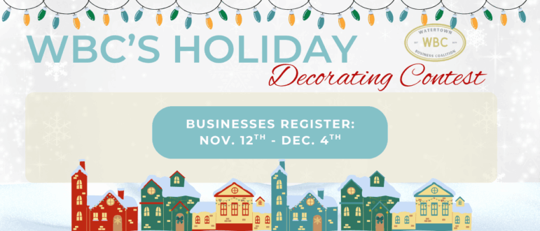 The Watertown Business Coalition is excited to run our first Annual Holiday Decorating Contest! We’re calling on all Watertown businesses to help bring the cheer this holiday season by decorating your entrance, storefront, or any outdoor displays you have! Bring out the lights, paint, ornaments, snow – anything that makes your business pop! Get creative and have fun, the possibilities are endless!