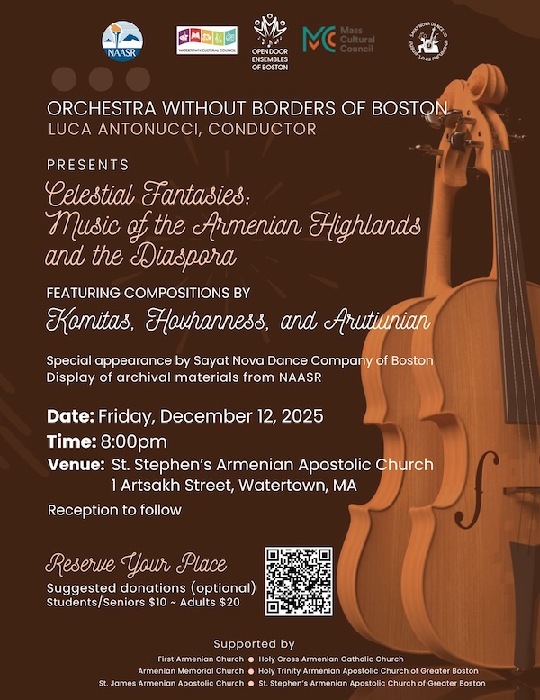 On December 12th at 8 p.m. at the historic St. Stephen’s Armenian Apostolic Church in Watertown, MA — where Komitas’s music forms part of the weekly liturgy — the Orchestra Without Borders of Boston, led by conductor Luca Antonucci, will perform the Armenian Folk Songs transcribed by Aslamazyan in collaboration with the women of the internationally-renowned Sayat Nova Dance Company, a leading Armenian dance organization. The concert, which is sponsored by the Watertown and Mass Cultural Councils and co-hosted by six local Armenian churches, also features a special archival display from the collection of NAASR, the National Association for Armenian Studies and Research.