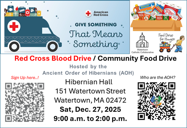 “This event will be a combined blood drive and food drive, with donated food items benefiting the Watertown Catholic Collaborative, allowing us to support both local families and those in medical need,” said the Hibernians’ announcement. “Whether you are able to donate blood, contribute food, or help spread the word, your continued support means so much. We hope you will consider joining us once again as we close out the year with an opportunity to give back.”