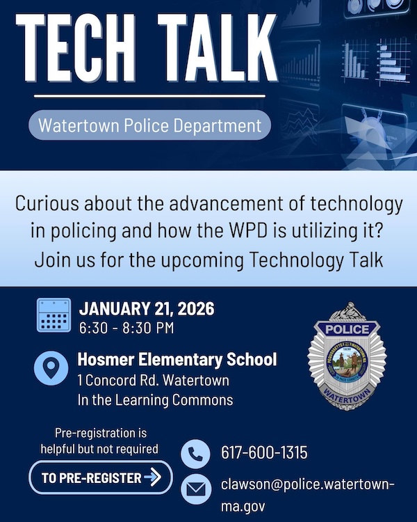The Watertown Police will discuss the technology used by the WPD at the Tuesday Night Talk on Jan. 21. Topics will include the cameras that can take pictures of license plates, body cameras, and more. See more info in the announcement from the Watertown Police, below.