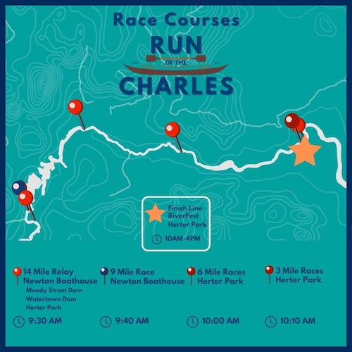 Races begin in Brighton and Newton, running through Watertown, Waltham, and Cambridge. All races will finish at Herter/Artesani Park in Brighton. Choose from four great courses, from the 3 mile paddle to the 14-mile team relay.