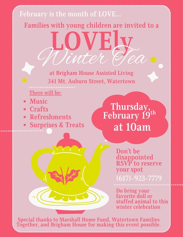 February is the month of LOVE … Families with young children are invited to a LOVEly Winter Tea at Brigham House Assisted Living, 341 Mt. Auburn St., Watertown.