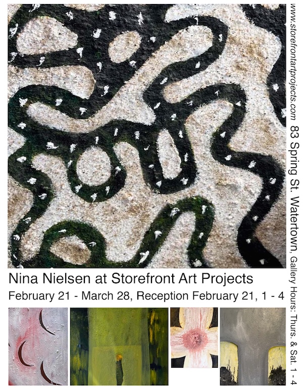 The art of Nina Nielsen will be at Storefront Art Projects in Watertown from Feb. 21 through March 28, 2026. An opening reception will be held Feb. 21, 1-4 p.m. See more information in the announcement from the gallery, below.