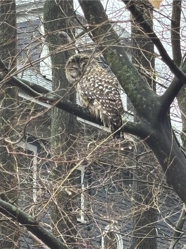 On Sunday, January 11th, we were amazed to see a beautiful barred owl sitting on a low branch in our backyard. We live next to Whitney Hill in Watertown, and had been hearing barred owl calls in the evening over the past few weeks (“who cooks for you?!”).