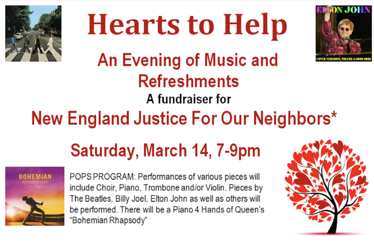 Belmont-Watertown United Methodist Church presents its annual fundraising concert, “Hearts to Help,” in support of New England Justice For Our Neighbors (NEJFON), an agency which provides free legal services to low- and no-income immigrants.