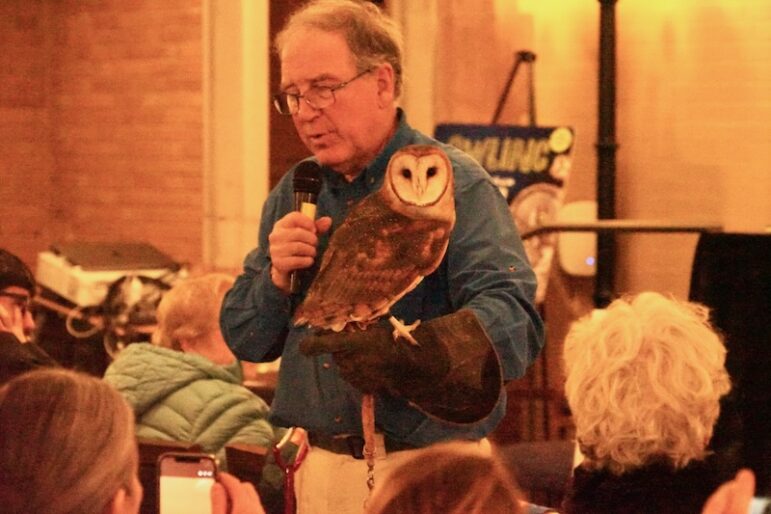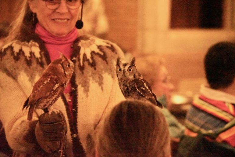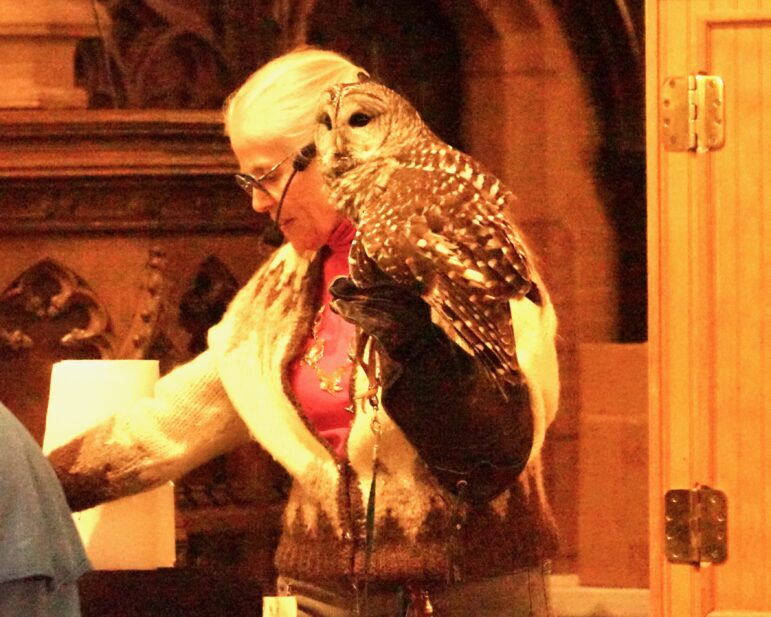 The Wilsons walked around with the owls on their arms so that people in the Story Chapel could get a close look at the birds.