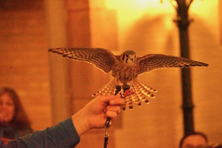 The bird travel in wooden boxes, and have a tether to keep them from trying to fly away. When Marcia opens the door of the box, a bird emerges. The Wilsons brought a pair of Eastern Screech Owls, a Barred Owl, a Barn Owl, a Great Horned Owl, a Eurasian Eagle Owl (one of the largest in the world), as well as an American Kestrel.