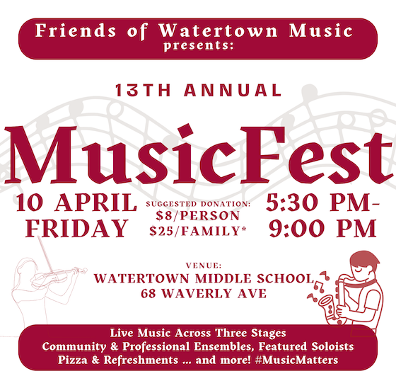 Calling all musicians: Friends of Watertown Music invites performers to register for our 13th Annual Watertown MusicFest. Deadline: March 26th — performance slots are limited.