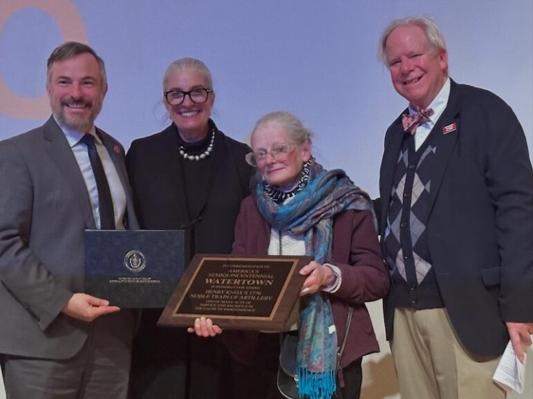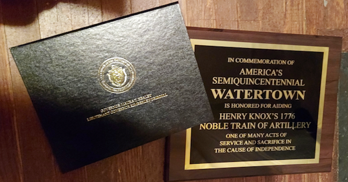 “A half-century ago I saw a reenactment with horses and oxen pass along Mt. Auburn Street, past the Knox Trail marker in front of the East Branch Library, to O’Connell Park where they camped overnight,” said Roach who accepted a plaque and citation on behalf of Watertown. Both items are now in City Hall.