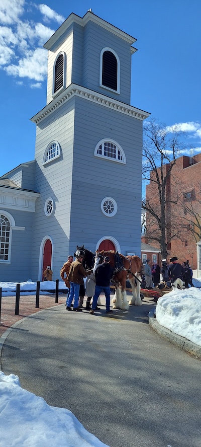 On Saturday, Feb. 28, preceded by fifes and drums, Colonial militia, and other re-enactors, a team of Clydesdales hauled a replica canon lashed to a sled across Harvard Square to the main Cambridge Public Library. Representatives from Weston, Waltham, Watertown, and Cambridge celebrated the parts played by their respective towns and cities in the history of Knox’s trek.