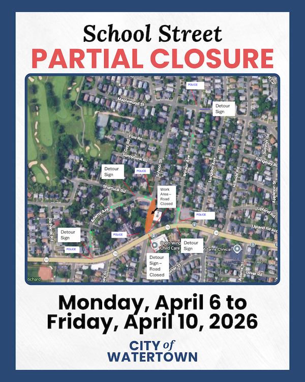 The roadway and sidewalks along a section of School Street off Mt. Auburn Street will be closed this week during installation of drainage and other work as part of the Mt. Auburn Street Project. See more details in the announcement from the City of Watertown.