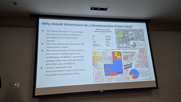 The Demonstration Project is a test case, of sorts, for the larger Revitalization Plan. In September, the City Council voted to proceed with planning for a Revitalization Plan, which would include a larger portion of the Watertown Square area. Proakis mentioned the parking lots behind the Watertown Library (owned by the City), and the lot behind the former Santander Bank (privately owned).