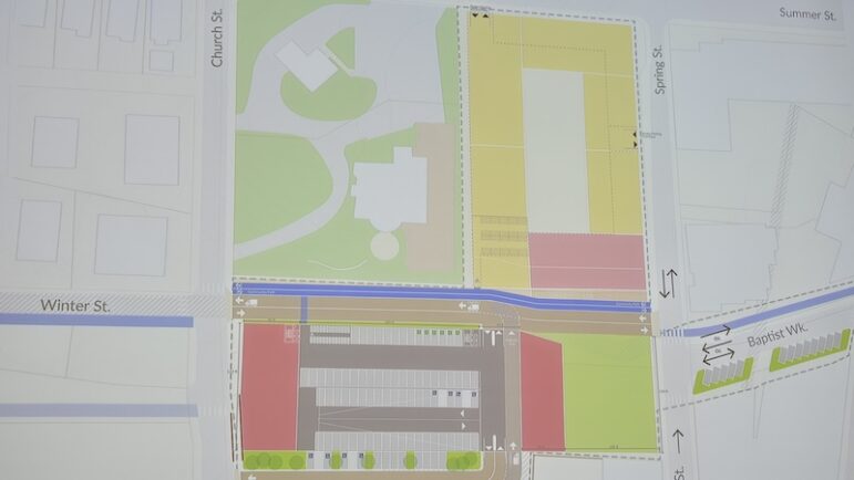 A section of the Watertown Community Path was shown running along Baptist Walk from Mt. Auburn Street to Spring Street, and running east-west through the property in an area that is now just north of the Gray Block.