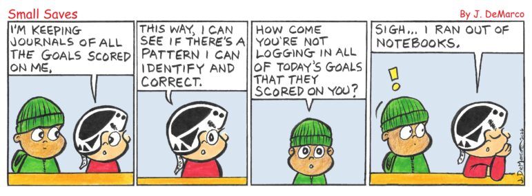 Combining this with the love of cartooning Small Saves emerged in 1991 and took on a life of his own. “To play goal – then come home and draw Small Saves — is my ideal definition of a good day.”