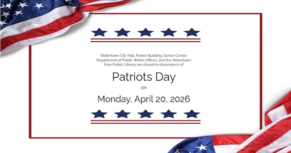 Watertown City Hall, Parker Building, Senior Center, Department of Public Works Offices, and the Watertown Free Public Library are closed in observance of Patriots Day on Monday, April 20, 2026.