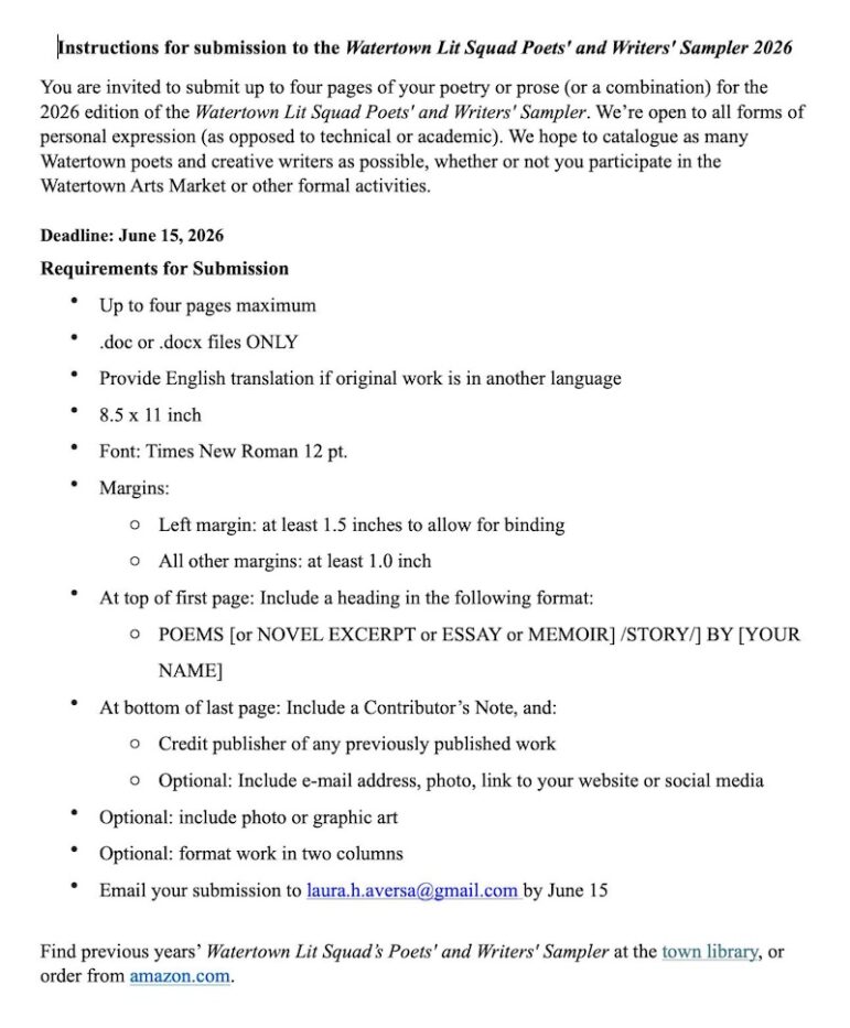 Watertown creative writers of all ages, abilities, and experiences, previously published or unpublished, may participate. They have an active Facebook page: @watertownlitsquad with regular postings of local literary news. Their steering committee includes Elizabeth Rodgers, Patrick Fairbairn, DeWitt Henry, Patti Cassidy, Laura Aversa, and Ricardo Alvarez, They have open discussion sessions at the Library on the second Tuesday of each month from 7-8:30, where local writers are welcome to join in.
