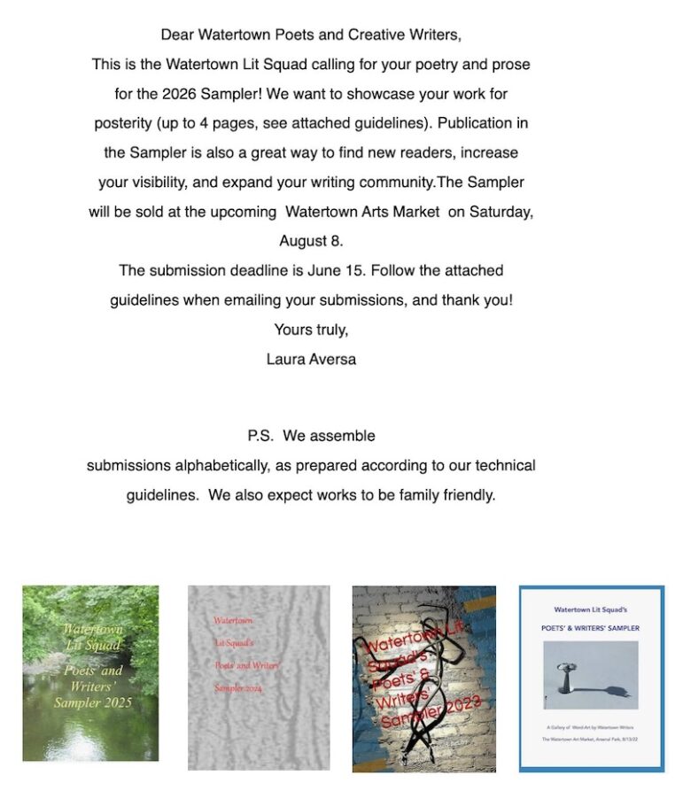 Watertown’s Lit Squad is a cohort of writers who reside in Watertown and neighboring communities and who first gathered in 2021 to celebrate their word arts as part of the annual Watertown Arts Market.