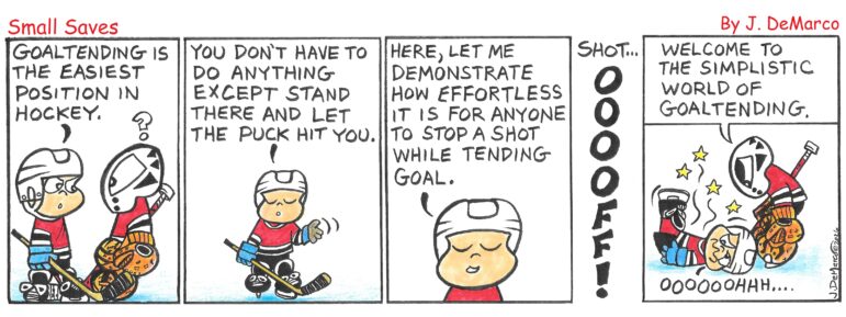 Combining this with the love of cartooning Small Saves emerged in 1991 and took on a life of his own. “To play goal – then come home and draw Small Saves — is my ideal definition of a good day.”