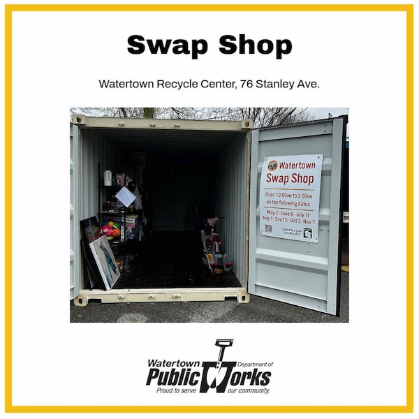 The Watertown Swap Shop re-opens for its second season this Saturday, May 2. The Swap Shop is located at the Recycling Center, 76 Stanley Ave., Watertown. The Swap Shop will be open on the first Saturday of each month, May to November, from 10 a.m.-2 p.m., except July when it will be open on the second Saturday. Bring your no-longer needed small items in good condition to the Swap Shop and/or take up to eight items home with you. No clothing or textiles.