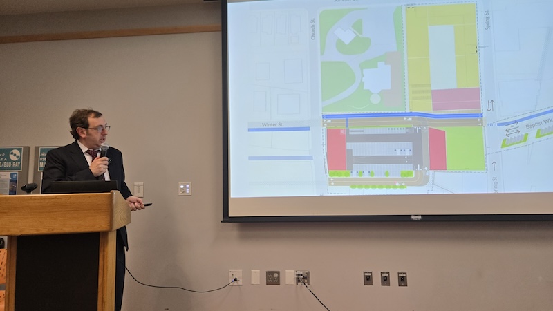 Watertown City Manager George Proakis gave some details about a possible Demonstration Project on the Municipal Parking Lot in Watertown Square. (Photo by Charlie Breitrose)