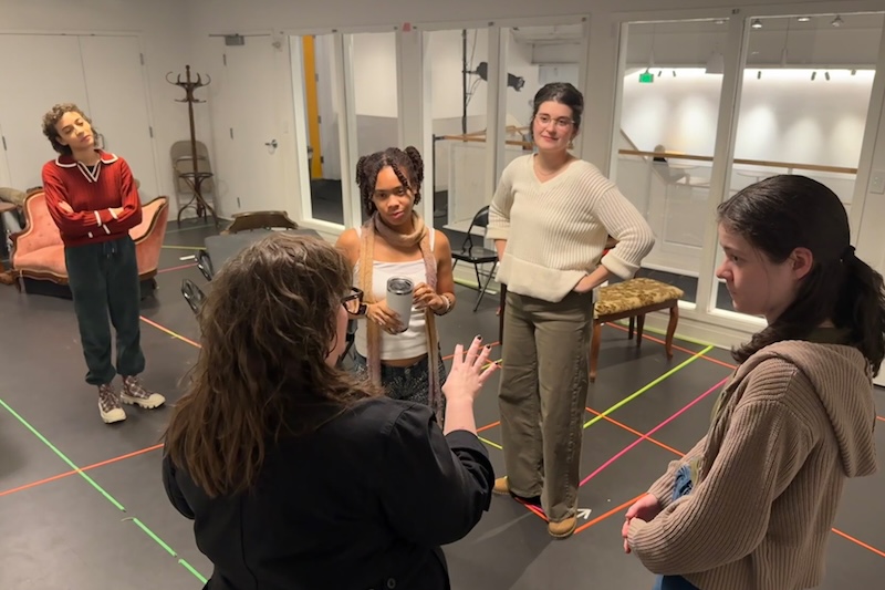 Director Shana Gozansky (center, left) addresses (from left) Aislinn Brophy, Chloe McFarlane, Olivia Fenton, and Kaila Pelton-Flavin in rehearsal for Actors’ Shakespeare Project’s “Little Women.” (Photo courtesy of Actors’ Shakespeare Project)