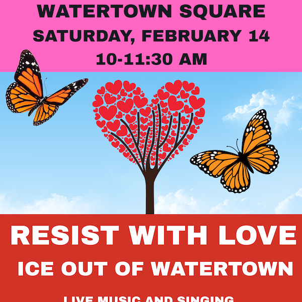 All are welcome to join in the Resist With Love Stand Out Against ICE in Watertown Square on Saturday, Feb. 14th, Valentine’s Day, from 10-11:30 a.m. Bring a sign, Bring a friend. Be ready to sing with B-Vocal. Wear something red. This is a peaceful, non-violent protest.